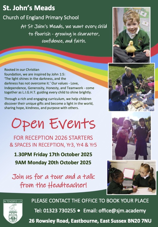 Our motto (IN TENEBRIS LUX) is ‘Light in Darkness’. It is our hope that children at St John’s Meads will develop their understanding and experience of Jesus as their ‘light in darkness’ and to consider how they can be a light to the world, making a positive contribution to society both now and in the future.