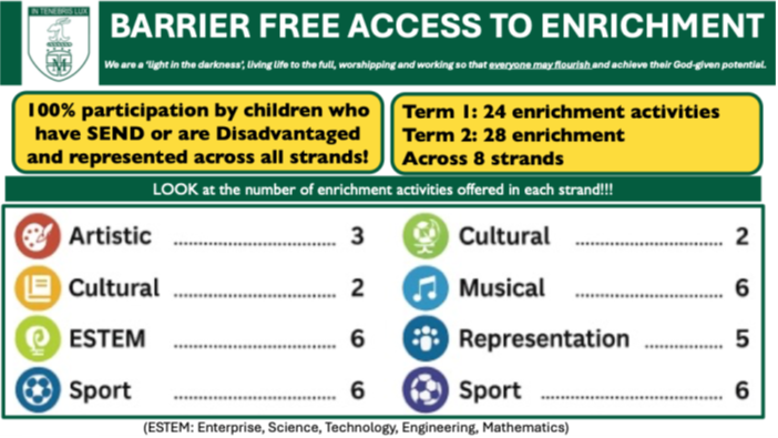 Every child matters. We make sure that 100% of pupils, including those with special educational needs and/or disabilities and those who are disadvantaged, take part in at least one enrichment activity each term across all six strands. This is part of our promise to provide equity and opportunity for all.