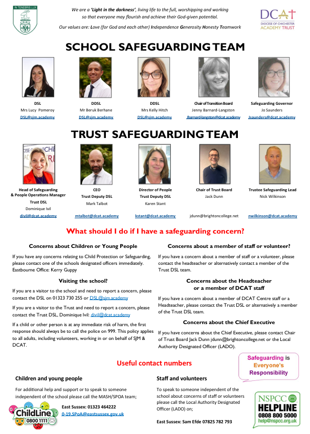 The Diocese of Chichester Academy Trust and all its Local Governing Bodies take seriously their responsibilities to safeguard and promote the welfare of children; and to work together with to ensure arrangements within our schools identify, assess and support those children and young people who are suffering harm. DCAT expect all staff, employees and volunteers to share this commitment.